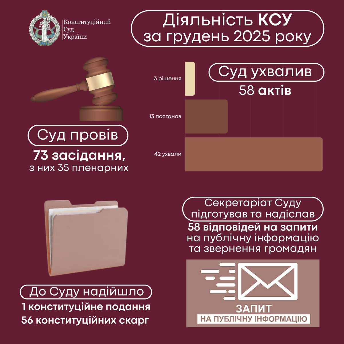 У грудні 2025 року Конституційний Суд України провів 73 засідання, із них: