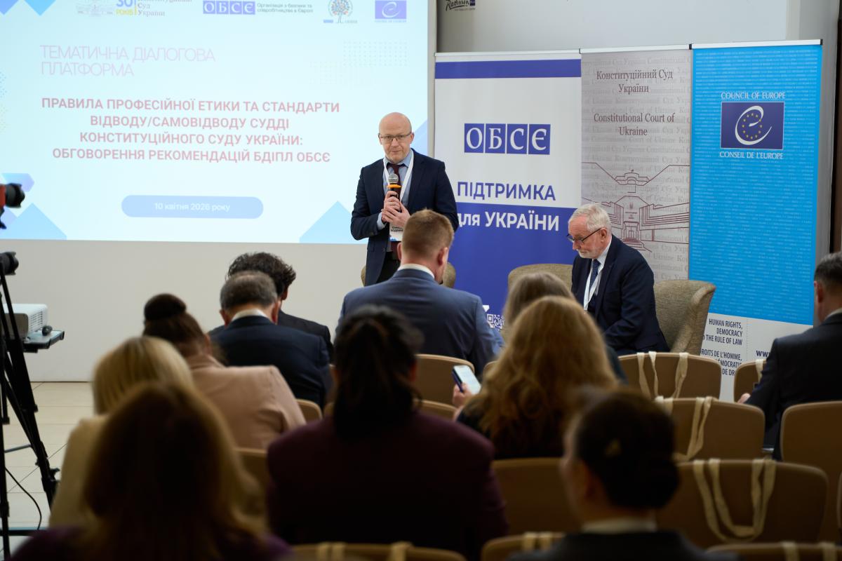 10 квітня 2026 року відбулася тематична діалогова платформа „Правила професійної етики та стандарти відводу/самовідводу судді Конституційного Суду України: обговорення рекомендацій Бюро з демократичних інститутів і прав людини ОБСЄ“.