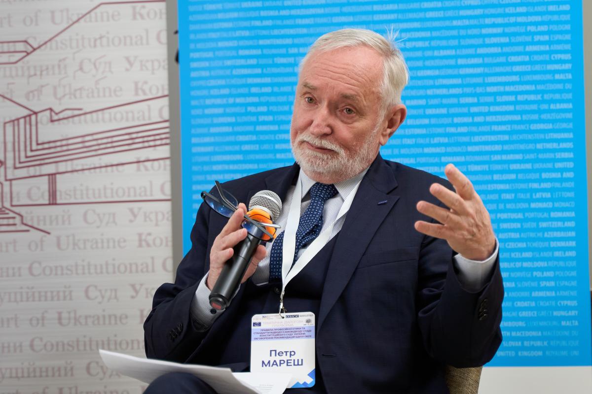 Спеціальний представник Головування – Координатор проєктів ОБСЄ в Україні Петр Мареш, звертаючись до учасників, наголосив на особливій ролі Конституційного Суду України в умовах сучасних викликів. Він підкреслив, що у процесі демократичного розвитку та європейської інтеграції України значення конституційного контролю лише зростатиме. Адже саме на рівні конституційного правосуддя вирішуються питання, від яких залежить належне функціонування держави та її конституційного порядку. У цьому контексті, за його словами, професійна якість рішень Суду нерозривно пов’язана з високими етичними стандартами діяльності його суддів. Петер Мареш окремо відзначив важливість взаємодії між КСУ, ОБСЄ, БДІПЛ та Радою Європи у підтримці реформ, спрямованих на зміцнення незалежності, авторитету та ефективності конституційної юстиції.