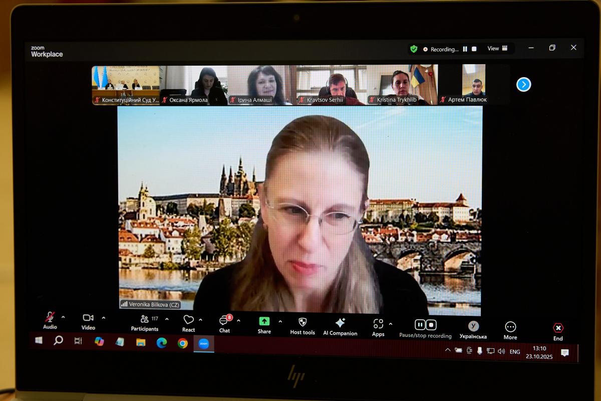 Доповідачкою виступила Віце-Президент Венеційської Комісії, професор міжнародного публічного права Карлового університету (м.Прага) Вероніка Білкова, яка зосередила увагу на діяльності консультативного органу Ради Європи з питань конституційного права – Європейської комісії „За демократію через право“ (Венеційська Комісія), а також формах її взаємодії з Україною.